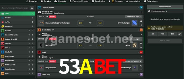 O 53Abet oferece uma grande seleção de opções de apostas em e-sports com probabilidades competitivas